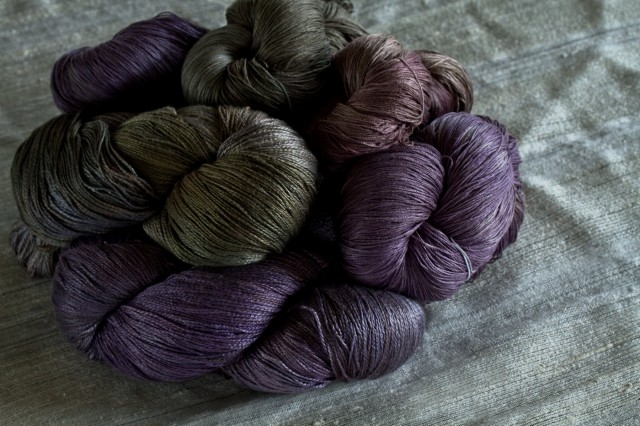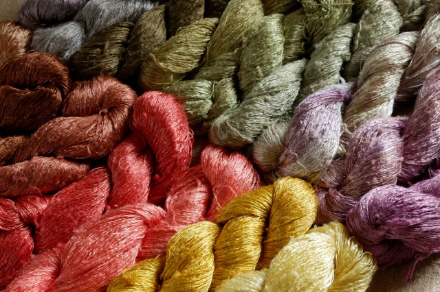 工房では様々な素材の糸を染めますが、今回は綿、綿麻、シルクリネン、シルクの糸をメインにお持ちします。