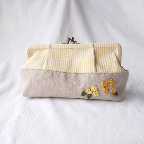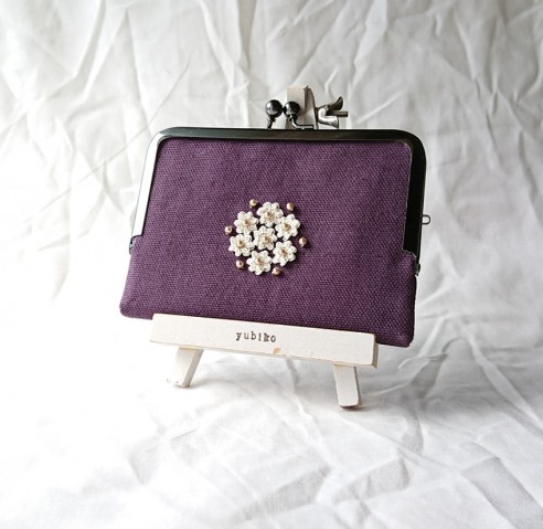 ●モチーフのスリムがまぐち…上記のがまぐちの表側に、かぎ針編みで編んだモチーフを縫い付けました。
